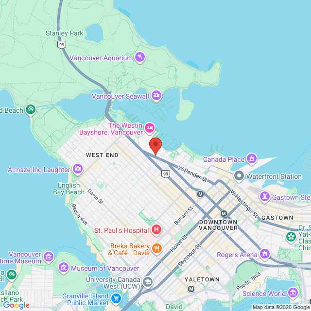 Metered parking is available on Nicola St, Broughton St, and W Hastings St.